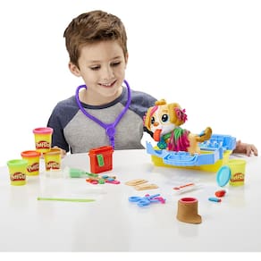 Conjunto Massinha Play-Doh Veterinário Pet Shop da Hasbro com ferramentas de veterinário: carimbo de estetoscópio de brinquedo, termômetro, 5 tipos diferentes de curativos e muito mais. As crianças podem criar a língua e pelos do cachorrinho com Play-Doh, além de poder criar estilos diferentes pro pet. A casinha do pet também inclui moldes divertidos para criar e usar a imaginação. Certamente conquistará os corações dos pequenos amantes de animais! Com 5 cores compostas de modelagem clássicas, este kit de médico animal pronto para brincar é uma ótima atividade, Certamente conquistará os corações dos pequenos amantes de animais!