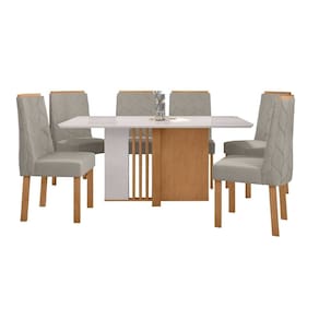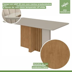 O conjunto de mesa Astrid com tampo de vidro e 6 cadeiras Apogeu é uma escolha elegante e funcional para sua sala de jantar. A mesa Astrid apresenta um design moderno e minimalista, com um tampo de vidro que adiciona um toque de sofisticação ao ambiente. Sua estrutura robusta garante estabilidade e durabilidade. As seis cadeiras Astrid complementam perfeitamente a mesa. Com um design contemporâneo e estofamento confortável, oferecem tanto estilo quanto comodidade durante as refeições. Seu acabamento de alta qualidade e detalhes cuidadosamente elaborados conferem uma estética atraente ao conjunto. Medida da Mesa (A x L x P): 78cmx170cmx90cm Peso da Mesa: 30 kg Mesa suporta até: 60 kg Acabamento da Cadeira/Banco: Pintura Acabamento da Mesa: Pintura UV Acompanha Manual de Instalação: Sim Almofada do assento: Fixa Ambiente Principal: Sala de Jantar Cadeira/Banco estofada: Encosto e Assento Estofados Cadeira/Banco suporta até: 120 kg Complexidade da Montagem: Média: pode ser montado por mais de uma pessoa e/ou necessite de maior conhecimento para montagem Cor: Amêndoa Clean/Off White/Capuccino Cor da Base: Marrom Cor do Produto: Amêndoa Clean/Off White/Capuccino Cor do Tampo: Bege Cor Secundária: Marrom De Canto (Canto Alemão): Não Design da Base: Retangular Enchimento do Assento: Espuma D-20 Enchimento do Encosto: Espuma D-18 Escala de Brilho: Fosco Espessura do Tampo: 29 mm Espessura do Vidro: mm Estrutura do Assento: MDF/MDP 25mm Estrutura do Encosto: MDF Formato do Tampo: Retangular Itens Inclusos: 1 Mesa com 6 Cadeiras, Ferragens e Manual de montagem Linha ou Coleção: Astrid Manual de Montagem e Instalação: https://product-hub-prd.madeiramadeira.com.br/912540/documents/19b22611-7b2e-4e60-9f83-926a1ac5a69f2022428ASTRID20COM20ASTRID.pdf Material da Base da Mesa: MDF/MDP Material da Estrutura da Cadeira: MDF Material do Tampo: Vidro/MDF Material Principal: MDF/MDP Material Principal das Cadeiras/Bancos: MDF Medida da Base (A x L x P): 73,9cmx100cmx55,8cm Medida da Cadeira/Banco (A x L x P): 104cmx46,5cmx60 Medida do Tampo (L x C x E): 170cmx90cmx29mm Mesa Dobrável: Não Mesa Extensível: Não Necessita Montagem: Sim Origem do Produto: Nacional Peso da Cadeira/Banco: 9,16 kg Possui Apoio para Braços: Não Possui Apoio Para os Pés: Não Possui Prateleiras: Não Possui Rodízio: Não Possui Suporte Giratório: Não Possui Vidro: Sim Quantidade de Cadeiras: 6 Quantidade de Lugares: 06 Recomendações de Uso, Manutenção e Limpeza: Limpar com flanela limpa e seca. Não usar produtos abrasivos. Revestimento da Cadeira/Banco: Veludo Sistema de Montagem: Parafusos Tipo de Assento: Fixo Tipo de Encosto: Fixo