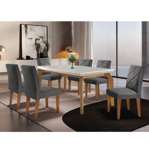 Sala de Jantar Dublin/Irlanda é um conjunto com design clássico e sofisticado, que irá fazer a diferença na sua decoração. Sua mesa possui o tampo amplo, com detalhe chanfrado, e suas cadeiras são revestidas em tecido, garantindo maior conforto e durabilidade. Além disso suas cadeiras tem o encosto com detalhe bordado que trazem um charme a mais. Sala de Jantar Dublin/Irlanda, produzida em material 100% MDF e tampo em MDF chanfrado. Em sua confecção é utilizada a pintura UV, que preserva a cor do produto por mais tempo. As cadeiras são revestidas com tecidos de alta qualidade, e estofadas com espuma D-23 no assento e espumas D-16 e D-18 no encosto. Mesa suporta até: 30.0000 Acabamento da Cadeira/Banco: Pintura UV Acabamento da Mesa: Pintura UV Almofada do assento: Fixa Altura do Conjunto: 98 cm Ambiente Principal: Sala de Jantar Apoio para Braços Estofado: Não Cadeira/Banco estofada: Encosto e Assento Estofados Cadeira/Banco Estofada: Encosto e Assento Estofados Cadeira/Banco suporta até: 100.0000 codigo_ean: 7909903107195 Complexidade da Montagem: Média: pode ser montado por mais de uma pessoa e/ou necessite de maior conhecimento para montagem Cor: Linho Grafite/Off White/imbuia Cor da Base: Marrom Enchimento do Assento: Espuma D-23 Enchimento do Encosto: Espuma D-18 Escala de Brilho: Semi-Fosco Estrutura do Assento: MDF Manual de Montagem e Instalação: https://product-hub-prd.madeiramadeira.com.br/22725-22726.pdf/documents/22725-22726.pdf Manutenção: Limpar com flanela ou pano macio seco, não utilizar produtos abrasivos, desengordurantes, álcool ou solvente. Não expor o produto diretamente à luz solar e à umidade. Material da Base da Mesa: MDF Material da Estrutura da Cadeira: MDF/Madeira Maciça Material do Tampo: MDF Material Principal: MDF Material Principal das Cadeiras/Bancos: MDF Mesa Dobrável: Não Mesa Extensível: Não Necessita Montagem: Sim Origem do Produto: Nacional Possui Apoio para Braços: Não Possui Apoio Para os Pés: Não Possui Rodízio: Não Possui Vidro: Não Quantidade de Cadeiras: 6 Recomendações de Uso, Manutenção e Limpeza: Limpar com flanela ou pano macio seco, não utilizar produtos abrasivos, desengordurantes, álcool ou solvente. Não expor o produto diretamente à luz solar e à umidade. Revestimento da Cadeira/Banco: Linho Sistema de Montagem: Parafusos, conectores, batentes de silicone e ponteiras. Tipo de Assento: Fixo Tipo de Encosto: Fixo Vidro Temperado: Não