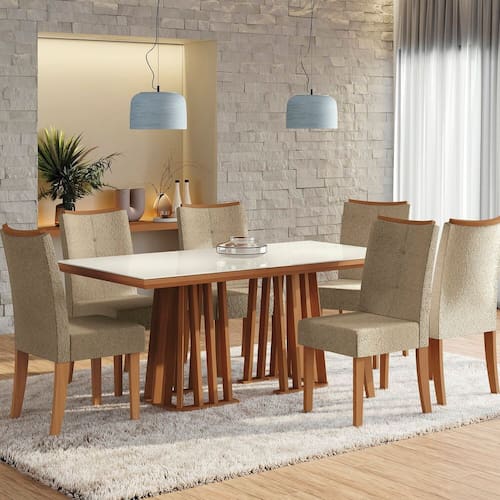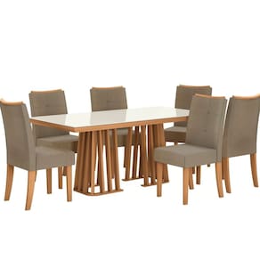 Sua Sala de Jantar de cara nova com a linha Kappesberg. A mesa, em MDP e pintura touch na cor canela, possui os pés divididos com design vazado e travessas na vertica. E quando combinada ao tampo retangular, acomoda até seis pessoas. Na cor canela, o destaque fica para o vidro na cor off white e o detalhe da quina reta, e com medidas de 180cm X 90cm e espessura de 5,0cm, ele suporta até 90kg. Já as cadeiras, em MDF e medindo 100cm de altura, sendo 49,5cm a altura do assento, 46cm de largura e 63cm de profundidade, possuem pintura touch na cor canela, suportando 120kg cada uma. Desmontada, o encosto e o assento são estofados e recobertos com tecido bouclé cinza. O encosto arredondado e o detalhe em costura e botonê completam seu diferencial, e o puxador amadeirado, facilita o manuseio.