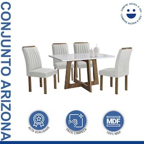 Renove sua sala de jantar com o conjunto Mesa Arizona, acompanhado por quatro cadeiras. A mesa apresenta um design contemporâneo e espaçoso, perfeito para refeições em família e pequenos encontros. As cadeiras oferecem conforto e estilo, criando um ambiente acolhedor para suas refeições. Juntos, este conjunto proporciona uma experiência agradável e elegante à mesa. Medida da Mesa (A x L x P): 79cmx120cmx90cm Peso da Mesa: 46 Mesa suporta até: 40 Acabamento da Cadeira/Banco: Pintura Acabamento da Mesa: Pintura UV Acompanha Manual de Instalação: Sim Almofada do assento: Fixa Almofada do encosto: Fixa Ambiente Principal: Sala de Jantar Cadeira/Banco estofada: Encosto e Assento Estofados Cadeira/Banco suporta até: 120 Complexidade da Montagem: Alta: deve ser montado por um montador especializado Cor: Chocolate/Off White/Gelo Cor da Base: Marrom Cor do Produto: Chocolate/Off White/Gelo Cor do Tampo: Bege Cor Secundária: Marrom De Canto (Canto Alemão): Não Enchimento do Assento: Espuma D-23 Enchimento do Encosto: Espuma D-20 Escala de Brilho: Fosco Espessura do Tampo: 29 Estrutura do Assento: MDF Estrutura do Encosto: MDF Formato do Tampo: Retangular Itens Inclusos: 1 Mesa Arizona com 4 cadeiras e manual de montagem Linha ou Coleção: Arizona Manual de Montagem e Instalação: https://cdn2.madeiramadeira.com.br/prd/cel-moveis/1825981-CONJUNTO%20ARIZONA%20-%20MESA%20DUBAI%20CADEIRA%20DUBAI.pdf Material da Base da Mesa: MDF Material da Estrutura da Cadeira: MDF Material do Tampo: Vidro/MDF Material Principal: MDF Material Principal das Cadeiras/Bancos: MDF Medida da Cadeira/Banco (A x L x P): 97,5cmx58cmx44cm Medida do Tampo (L x C x E): 120cmx90cmx2,9cm Mesa Dobrável: Não Mesa Extensível: Não Necessita Montagem: Sim Origem do Produto: Nacional Peso da Cadeira/Banco: 9.1 Possui Apoio para Braços: Não Possui Apoio Para os Pés: Não Possui Prateleiras: Não Possui Rodízio: Não Possui Suporte Giratório: Não Possui Vidro: Sim Quantidade de Cadeiras: 4 Quantidade de Lugares: 04 Recomendações de Uso, Manutenção e Limpeza: Limpar apenas com pano úmido. Revestimento da Cadeira/Banco: Veludo Sistema de Montagem: Parafusos Tipo de Assento: Fixo Tipo de Encosto: Fixo Vidro Temperado: Não