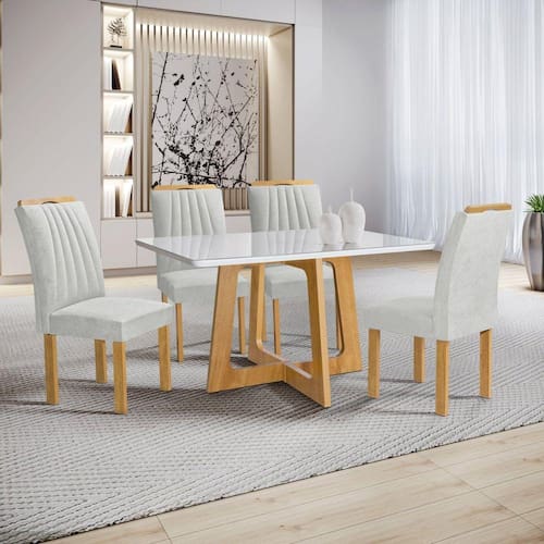 Renove sua sala de jantar com o conjunto Mesa Arizona, acompanhado por quatro cadeiras. A mesa apresenta um design contemporâneo e espaçoso, perfeito para refeições em família e pequenos encontros. As cadeiras oferecem conforto e estilo, criando um ambiente acolhedor para suas refeições. Juntos, este conjunto proporciona uma experiência agradável e elegante à mesa. Medida da Mesa (A x L x P): 79cmx120cmx90cm Peso da Mesa: 46 kg Mesa suporta até: 40.0000 Acabamento da Cadeira/Banco: Pintura Acabamento da Mesa: Pintura UV Acompanha Manual de Instalação: Sim Almofada do assento: Fixa Almofada do encosto: Fixa Ambiente Principal: Sala de Jantar Cadeira/Banco Estofada: Encosto e Assento Estofados Cadeira/Banco estofada: Encosto e Assento Estofados Cadeira/Banco suporta até: 120.0000 codigo_ean: 7909903605318 Complexidade da Montagem: Alta: deve ser montado por um montador especializado Cor: Cinamomo/Off White/Gelo Cor do Produto: Cinamomo/Off White/Gelo De Canto (Canto Alemão): Não Enchimento do Assento: Espuma D-23 Enchimento do Encosto: Espuma D-20 Escala de Brilho: Fosco Espessura do Tampo: 29 mm Estrutura do Assento: MDF Estrutura do Encosto: MDF Formato do Tampo: Retangular Itens Inclusos: 1 Mesa Arizona com 4 cadeiras e manual de montagem Linha ou Coleção: Arizona Manual de Montagem e Instalação: https://product-hub-prd.madeiramadeira.com.br/895745/documents/fca12635-5d08-4744-a3a1-08ea8148aa59ESA20DUBAI20CADEIRA20DUBAI.pdf Material da Base da Mesa: MDF Material da Estrutura da Cadeira: MDF Material do Tampo: Vidro/MDF Material Principal: MDF Material Principal das Cadeiras/Bancos: MDF Medida da Cadeira/Banco (A x L x P): 97,5cmx58cmx44cm Medida do Tampo (L x C x E): 120cmx90cmx2,9cm Mesa Dobrável: Não Mesa Extensível: Não Necessita Montagem: Sim Origem do Produto: Nacional Peso da Cadeira/Banco: 9,1 kg Possui Apoio para Braços: Não Possui Apoio Para os Pés: Não Possui Prateleiras: Não Possui Suporte Giratório: Não Possui Vidro: Sim Quantidade de Cadeiras: 4 Quantidade de Lugares: 04 Recomendações de Uso, Manutenção e Limpeza: Limpar apenas com pano úmido. Revestimento da Cadeira/Banco: Veludo Sistema de Montagem: Parafusos Tipo de Assento: Fixo Tipo de Encosto: Fixo Vidro Temperado: Não