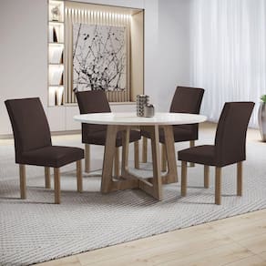 Transforme sua sala de jantar com o conjunto Mesa Arizona redonda, acompanhado por quatro cadeiras. Com um design moderno e elegante, esta mesa oferece o cenário perfeito para refeições íntimas e conversas animadas. As quatro cadeiras, confortáveis e estilosas, complementam a mesa, proporcionando uma experiência de jantar agradável. Juntos, este conjunto cria um ambiente acolhedor e convidativo para momentos especiais à mesa. Medida da Mesa (A x L x P): 79cmx120cmx120cm Peso da Mesa: 40,8 kg Mesa suporta até: 40.0000 Acabamento da Cadeira/Banco: Pintura Acabamento da Mesa: Pintura UV Acompanha Manual de Instalação: Sim Almofada do assento: Fixa Ambiente Principal: Sala de Jantar Cadeira/Banco estofada: Encosto e Assento Estofados Cadeira/Banco Estofada: Encosto e Assento Estofados Cadeira/Banco suporta até: 120.0000 codigo_ean: 7909903602522 Complexidade da Montagem: Alta: deve ser montado por um montador especializado Cor: Chocolate/Off White/Marrom Cor do Produto: Chocolate/Off White/Marrom De Canto (Canto Alemão): Não Enchimento do Assento: Espuma D-23 Enchimento do Encosto: Espuma D-20 Escala de Brilho: Fosco Espessura do Tampo: 29 mm Estrutura do Assento: MDF Estrutura do Encosto: MDF Itens Inclusos: 1 Mesa Arizona com 4 cadeiras e manual de montagem Linha ou Coleção: Arizona Manual de Montagem e Instalação: https://product-hub-prd.madeiramadeira.com.br/895779/documents/6c4ca005-53c5-4b2f-b092-0e1c2149fa79SA20DUBAI20CADEIRA20NAPOLE.pdf Material da Base da Mesa: MDF Material da Estrutura da Cadeira: MDF Material do Tampo: Vidro/MDF Material Principal: MDF Material Principal das Cadeiras/Bancos: MDF Medida da Cadeira/Banco (A x L x P): 96,5cmx56cmx44cm Medida do Tampo (L x C x E): 120cmx120cmx2,9cm Mesa Dobrável: Não Mesa Extensível: Não Necessita Montagem: Sim Origem do Produto: Nacional Peso da Cadeira/Banco: 9,1 kg Possui Apoio para Braços: Não Possui Apoio Para os Pés: Não Possui Prateleiras: Não Possui Suporte Giratório: Não Possui Vidro: Sim Quantidade de Cadeiras: 4 Quantidade de Lugares: 04 Recomendações de Uso, Manutenção e Limpeza: Limpar apenas com pano úmido. Revestimento da Cadeira/Banco: Veludo Sistema de Montagem: Parafusos Tipo de Assento: Fixo Tipo de Encosto: Fixo