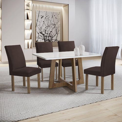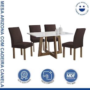 Renove sua sala de jantar com o conjunto Mesa Arizona, acompanhado por quatro cadeiras. A mesa apresenta um design contemporâneo e espaçoso, perfeito para refeições em família e pequenos encontros. As cadeiras oferecem conforto e estilo, criando um ambiente acolhedor para suas refeições. Juntos, este conjunto proporciona uma experiência agradável e elegante à mesa. Medida da Mesa (A x L x P): 79cmx120cmx90cm Peso da Mesa: 46 kg Mesa suporta até: 40.0000 Acabamento da Cadeira/Banco: Pintura Acabamento da Mesa: Pintura UV Acompanha Manual de Instalação: Sim Almofada do assento: Fixa Almofada do encosto: Fixa Ambiente Principal: Sala de Jantar Cadeira/Banco Estofada: Encosto e Assento Estofados Cadeira/Banco estofada: Encosto e Assento Estofados Cadeira/Banco suporta até: 120.0000 codigo_ean: 7909903605066 Complexidade da Montagem: Alta: deve ser montado por um montador especializado Cor: Chocolate/Off White/Marrom Cor do Produto: Chocolate/Off White/Marrom De Canto (Canto Alemão): Não Enchimento do Assento: Espuma D-23 Enchimento do Encosto: Espuma D-20 Escala de Brilho: Fosco Espessura do Tampo: 29 mm Estrutura do Assento: MDF Estrutura do Encosto: MDF Formato do Tampo: Retangular Itens Inclusos: 1 Mesa Arizona com 4 cadeiras e manual de montagem Linha ou Coleção: Arizona Manual de Montagem e Instalação: https://product-hub-prd.madeiramadeira.com.br/895717/documents/9ee5d5b0-3dce-4e0f-be08-806a068174e6SA20DUBAI20CADEIRA20NAPOLE.pdf Material da Base da Mesa: MDF Material da Estrutura da Cadeira: MDF Material do Tampo: Vidro/MDF Material Principal: MDF Material Principal das Cadeiras/Bancos: MDF Medida da Cadeira/Banco (A x L x P): 96,5cmx56cmx44cm Medida do Tampo (L x C x E): 120cmx90cmx2,9cm Mesa Dobrável: Não Mesa Extensível: Não Necessita Montagem: Sim Origem do Produto: Nacional Peso da Cadeira/Banco: 9,1 kg Possui Apoio para Braços: Não Possui Apoio Para os Pés: Não Possui Prateleiras: Não Possui Suporte Giratório: Não Possui Vidro: Sim Quantidade de Cadeiras: 4 Quantidade de Lugares: 04 Recomendações de Uso, Manutenção e Limpeza: Limpar apenas com pano úmido. Revestimento da Cadeira/Banco: Veludo Sistema de Montagem: Parafusos Tipo de Assento: Fixo Tipo de Encosto: Fixo Vidro Temperado: Não