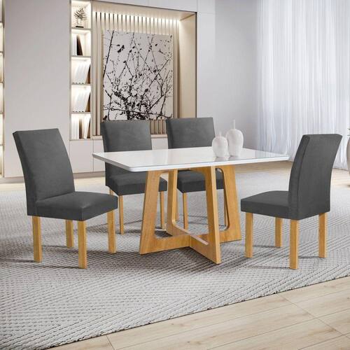 Renove sua sala de jantar com o conjunto Mesa Arizona, acompanhado por quatro cadeiras. A mesa apresenta um design contemporâneo e espaçoso, perfeito para refeições em família e pequenos encontros. As cadeiras oferecem conforto e estilo, criando um ambiente acolhedor para suas refeições. Juntos, este conjunto proporciona uma experiência agradável e elegante à mesa.