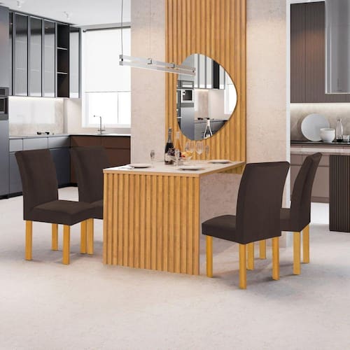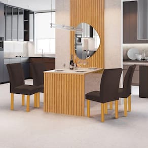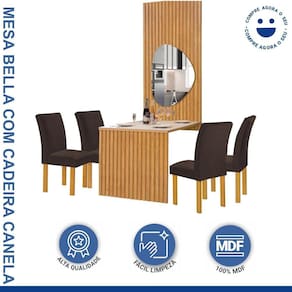 Dê um toque de charme à sua sala de jantar com o conjunto Mesa Bella, acompanhado por quatro cadeiras. A mesa, com seu design refinado e acabamento impecável, torna-se o centro das atenções, oferecendo um espaço generoso para refeições memoráveis. As cadeiras, elegantes e confortáveis, completam o conjunto, proporcionando o ambiente ideal para desfrutar de momentos especiais com sua família e amigos. Transforme sua sala de jantar em um espaço acolhedor e elegante com o conjunto Mesa Bella. Medida da Mesa (A x L x P): 250cmx120cmx90cm Peso da Mesa: 77,2 kg Mesa suporta até: 40.0000 Acabamento da Cadeira/Banco: Pintura Acabamento da Mesa: Pintura UV Acompanha Manual de Instalação: Sim Almofada do assento: Fixa Ambiente Principal: Sala de Jantar Cadeira/Banco Estofada: Encosto e Assento Estofados Cadeira/Banco estofada: Encosto e Assento Estofados Cadeira/Banco suporta até: 120.0000 codigo_ean: 7909903600801 Complexidade da Montagem: Alta: deve ser montado por um montador especializado Cor: Cinamomo/Off White/Veludo Marrom Cor do Produto: Cinamomo/Off White/Veludo Marrom De Canto (Canto Alemão): Não Enchimento do Assento: Espuma D-23 Enchimento do Encosto: Espuma D-20 Escala de Brilho: Fosco Espessura do Tampo: 29 mm Estrutura do Assento: MDF Estrutura do Encosto: MDF Formato do Tampo: Retangular Itens Inclusos: 1 Mesa Bella com 4 cadeiras e manual de montagem Linha ou Coleção: Bella Manual de Montagem e Instalação: https://product-hub-prd.madeiramadeira.com.br/895853/documents/841bc6dc-30e6-4904-85d7-a77e79fbdb2020CANELA2020CANCUN20NAPOLE.pdf Material da Base da Mesa: MDF Material da Estrutura da Cadeira: MDF Material do Tampo: Vidro/MDF Material Principal: MDF Material Principal das Cadeiras/Bancos: MDF Medida da Cadeira/Banco (A x L x P): 96,5cmx56cmx44cm Medida do Tampo (L x C x E): 120cmx90cmx2,9cm Mesa Dobrável: Não Mesa Extensível: Não Necessita Montagem: Sim Origem do Produto: Nacional Peso da Cadeira/Banco: 9,1 kg Possui Apoio para Braços: Não Possui Apoio Para os Pés: Não Possui Prateleiras: Não Possui Suporte Giratório: Não Possui Vidro: Sim Quantidade de Cadeiras: 4 Quantidade de Lugares: 04 Recomendações de Uso, Manutenção e Limpeza: Limpar apenas com pano úmido. Revestimento da Cadeira/Banco: Veludo Sistema de Montagem: Parafusos Tipo de Assento: Fixo Tipo de Encosto: Fixo