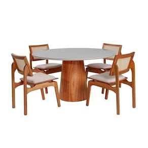 O Conjunto Mesa Daren com 4 cadeiras de Madeira Maciça Tauari, Rattan Natural e Estofada Daren uniu design moderno à resistência da madeira Maciça, indo além do estilo e modernidade.