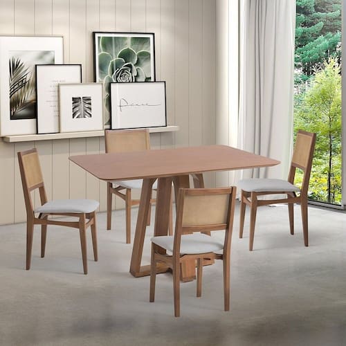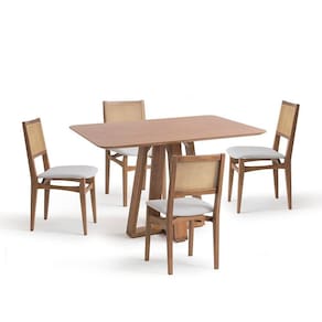 Com o conjunto Serena você vai ter uma casa perfeita para receber amigos e familiares! Este conjunto conta com uma linda mesa com estrutura em madeira jequitibá, tampo laminado em madeira jequitibá e 4 cadeiras também produzidas em madeira jequitibá, encosto em fibra natural e assento em espuma, que acomodam super bem todo mundo. Já o revestimento do tecido e a valorização do amadeirado facilitam combiná-las com o restante dos móveis da casa e dão um toque elegante à decoração.