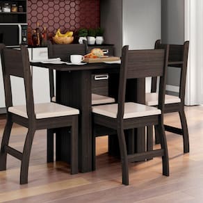 Conjunto Mesa de Jantar 4 lugares Milano da Poliman Móveis foi desenvolvido para trazer ainda mais beleza a sua cozinha o design aplicado junto a ergonomia do produto trará momentos agradáveis em família e amigos. A mesa possui bases com barras de travamento mais resistência e tampo retangular com estrutura em MDP e acabamento em pintura UV garantindo qualidade de acabamento. As cadeiras são em MDF/MDP 15 e 18mm com acabamento nas bordas em PS, assento revestido em courvin de alta resistência com manta de proteção interna de fácil limpeza. Disponível em padrões de cor brilho ou fosco com perfeita combinação nos mais variados ambientes. Qualidade que só a Poliman oferece em seus produtos. Acabamento da Cadeira/Banco: Pintura UV Acabamento da Mesa: Pintura UV Almofada do assento: Fixa Apoio para Braços Estofado: Não Cadeira/Banco estofada: Sim Cadeira/Banco suporta até: 100 kg Complexidade da Montagem: Média: pode ser montado por mais de uma pessoa e/ou necessite de maior conhecimento para montagem Cor: Amêndoa/Savana Cor do Produto: Amêndoa/Savana Enchimento do Assento: Espuma D-10 Enchimento do Encosto: Espuma D-10 Escala de Brilho: Fosco Espessura do Tampo: 150 mm Estrutura do Assento: Assento revestido em courvin, densidade da espuma D-11. Estrutura do Encosto: MDP 15mm Informações Complementares: Mesa em MDP de 15mm, cadeira com assentos com espuma revestida em courvin de alta resistência, trava traseira, pintura UV, cadeiras com bordas em PS. Itens Inclusos: 1 Mesa, 4 cadeiras, acessórios e manual de montagem. Linha ou Coleção: Linha Milano Manual de Montagem e Instalação: https://cdn2.madeiramadeira.com.br/atributo/poliman/778389-03-conjunto-4-lugares.zip Material da Base da Mesa: MDP Material da Estrutura da Cadeira: MDF/MDP Medida da Base (A x L x P): 75x38,5x57,5 Medida da Cadeira/Banco (A x L x P): 92cmx41cmx39cm Medida da Mesa (A x L x P): 77cmx67,5cmx108cm Medida do Tampo (L x C x E): 108cmx67,5x15cm Mesa suporta até: 50 kg Necessita Montagem: Sim Origem do Produto: Nacional Peso da Cadeira/Banco: 5 kg Peso da Mesa: 16 kg Possui Apoio para Braços: Não Possui Apoio Para os Pés: Não Possui Suporte Giratório: Não Recomendações de Uso, Manutenção e Limpeza: Para limpeza utilize pano macio levemente umedecido em água morna e na sequência pano seco. Não usar produtos químicos ou abrasivos para a limpeza. Revestimento da Cadeira/Banco: Couro Ecológico Sistema de Montagem: Parafusos, porcas zamac, cavilhas, pregos. Tamanho: