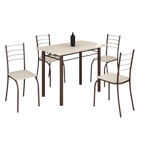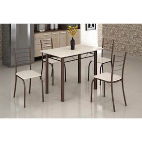 Conjunto Mesa com 4 Cadeiras Tampo em Granito Teixeira 100x60cm Marrom Off White O Conjunto de Mesa com 4 Cadeiras da Teixeira Móveis conta com sua estrutura em aço e pintura lisa, o que garante maior resistência e qualidade, sem perder a sofisticação do produto. Um móvel com design moderno, cheio de linhas que fazem da mesa um produto diferenciado e sofisticado. Você terá a possibilidade de usar esse produto em vários ambientes como cozinha, áreas de lazer entre outros, uma infinidade de combinações e usabilidade, que garante um ambiente moderno, descontraído com muito bom gosto e estilo.\nMEDIDAS\nAltura (Mesa) 75 cm\nLargura (Mesa) 60 cm\nProfundidade (Mesa) 100 cm\n \nAltura (Cadeira) 85 cm\nLargura (Cadeira) 36,5 cm\nProfundidade (Cadeira) 38,5 cm\nCARACTERÍSTICAS\nFabricante Teixeira Móveis\nTipo do produto Mesa com 4 Cadeiras\nAmbiente Diversos\nEstrutura Aço Tubular\nTecido Assento Tecido Sintético\nEspuma Assento D18\nTampo Granito Ocre\nNecessita Montagem Sim\nAcompanha Manual de Instalação Sim\nINFORMAÇÕES IMPORTANTES\nObjetos decorativos que porventura apareçam na foto, não acompanham o produto. Não nos responsabilizamos pela montagem/instalação dos produtos.\nMontagens, desmontagens e instalações são responsabilidades do cliente. Indicamos que contrate uma empresa de montagem ou um montador de sua confiança.\nAlém disso, favor verificar se os pés e acessórios estão dentro do forro inferior do produto. Em suma, todas as informações divulgadas sobre o produto são de responsabilidade do Fabricante.\nAs cores do produto podem variar de acordo com o seu monitor, a iluminação do ambiente em que você está e até mesmo a sua percepção visual. Além da cor, pequenos detalhes e acabamentos podem não ficar evidentes na foto, por isso as imagens são meramente ilustrativas.