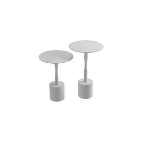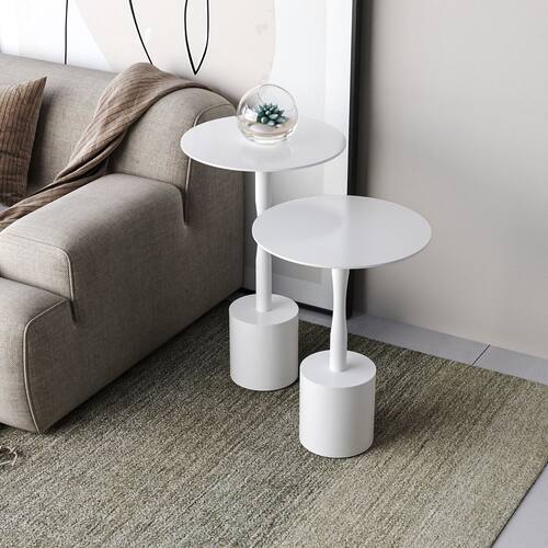 Composto por 02 mesas, tampos redondos, com borda invertida, base cilindrica fabricada com usinagem de alta precisão, haste em madeira maçiça,