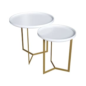 Composto por 02 mesas, tampos redondos, com borda, estrutura metalica em aço carbono na cor dourada.