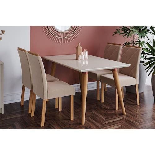 Sala de Jantar Completa Adele Madeira Maciça c/ Tampo Madeirado c/ Vidro 130x80cm e 4 Cadeiras Fernanda Madeirado/Off White - Cimol Abaixo segue os produtos do KIT: Sala de Jantar Completa Adele Madeira Maciça c/ Tampo Madeirado c/ Vidro 130x80cm e 4 Cadeiras Fernanda Madeirado/Off White - Cimol