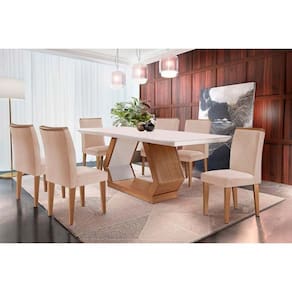 Conjunto: Mesa de Cozinha Alvorada c/ Tampo Madeirado Canto Reto 180x90cm e 6 Cadeiras Amsterdã Imbuia/Off White - Suede Creme - Rufato - Blush