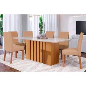 Conjunto: Mesa de Cozinha Ana Tampo Madeirado c/ Vidro 180x90cm e 6 Cadeiras Maia Nature/Off White - Nature/Suede Gengibre Bege - Cimol - Conjunto de Mesa de Cozinha com 6 Cadeiras