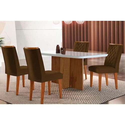 Sala de Jantar Completa Berlim c/ Tampo Madeirado c/ Vidro Canto Curvo 120x80cm e 4 Cadeiras Jade Imbuia/Off White - Suede Marrom - Rufato