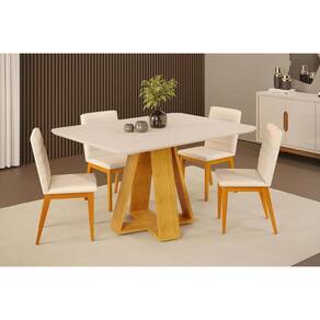 Sala de Jantar Completa Celeste c/ Tampo Madeirado c/ Vidro Curvo 120x90cm e 4 Cadeiras Sofia Cedro/Off White - Ipe/Linho Neve - DJ Móveis