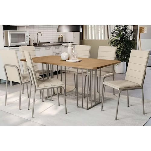 Sala de Jantar Completa Duina c/ Tampo de Madeira 160cm e 6 Cadeiras Amsterdã Niquel/Freijo - Courano Bege - Kappesberg
