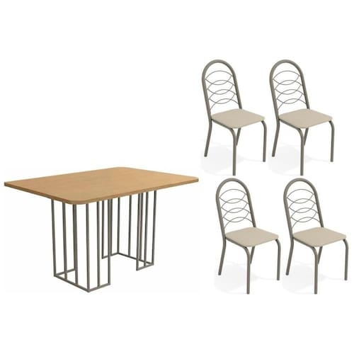 Conjunto: Mesa De Cozinha Duina C/ Tampo De Madeira 136cm E 4 Cadeiras Holanda Niquel/freijo - Courano Bege - Kappesberg