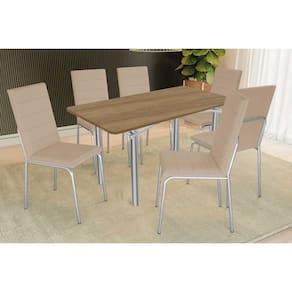 Sala de Jantar Completa Elba c/ Tampo de Madeira 160cm e 6 Cadeiras Amsterdã Cromada/Nogueira - Courano Bege - Kappesberg