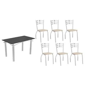 Sala de Jantar Completa Elba Tampo Madeirado c/ Vidro 120cm e 6 Cadeiras Portugal Cromada/Preto - Courano Bege - Kappesberg Abaixo segue os produtos do KIT: Sala de Jantar Completa Elba Tampo Madeirado c/ Vidro 120cm e 6 Cadeiras Portugal Cromada/Preto - Courano Bege - Kappesberg