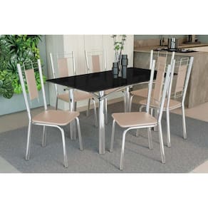 Sala de Jantar Completa Elba Tampo Madeirado c/ Vidro 160cm e 6 Cadeiras Florença Cromada/Preto - Courano Bege - Kappesberg