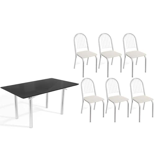 Sala de Jantar Completa Elba Tampo Madeirado c/ Vidro 160cm e 6 Cadeiras Noruega Cromada/Preto - Courano Branco - Kappesberg Abaixo segue os produtos do KIT: Sala de Jantar Completa Elba Tampo Madeirado c/ Vidro 160cm e 6 Cadeiras Noruega Cromada/Preto - Courano Branco - Kappesberg