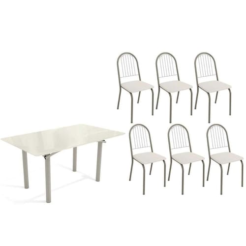 Sala de Jantar Completa Elba Tampo Madeirado c/ Vidro 160cm e 6 Cadeiras Noruega Niquel/Off White - Courano Branco - Kappesberg