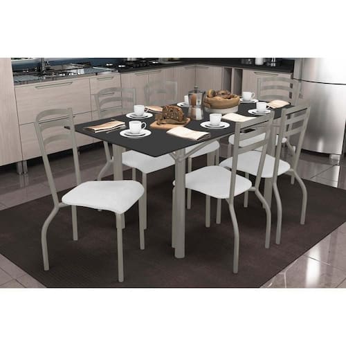 Sala de Jantar Completa Elba Tampo Madeirado c/ Vidro 160cm e 6 Cadeiras Portugal Niquel/Preto - Courano Branco - Kappesberg Abaixo segue os produtos do KIT: Sala de Jantar Completa Elba Tampo Madeirado c/ Vidro 160cm e 6 Cadeiras Portugal Niquel/Preto - Courano Branco - Kappesberg