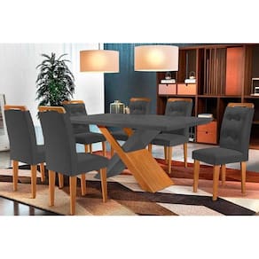 Conjunto: Mesa de Cozinha Imperatriz Tampo Madeirado c/ Vidro Reto 180x90 e 6 Cadeiras Imperatriz Capuccino/Suede Grafite - Rufato