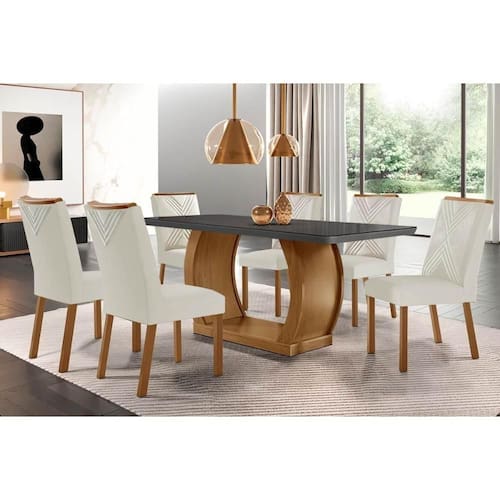 Abaixo segue os produtos do KIT: Sala de Jantar Completa Jade c/ Tampo Madeirado c/ Vidro Canto Curvo 180x90cm e 6 cadeiras Amsterdã Imbuia/Grafite - Suede Creme - Rufato
