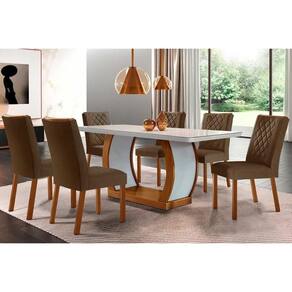 Conjunto: Mesa de Cozinha Jade Tampo Madeirado c/ Vidro Canto Curvo 180x90 e 6 Cadeiras Jade Imbuia/Off White - Suede Marrom - Rufato - Blush