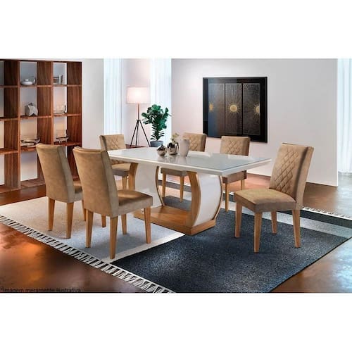 Abaixo segue os produtos do KIT: Sala de Jantar Completa Jade Tampo Madeirado c/ Vidro Canto Reto 180x90cm e 6 Cadeiras Jade Imbuia/Off White - Suede Capuccino - Rufato