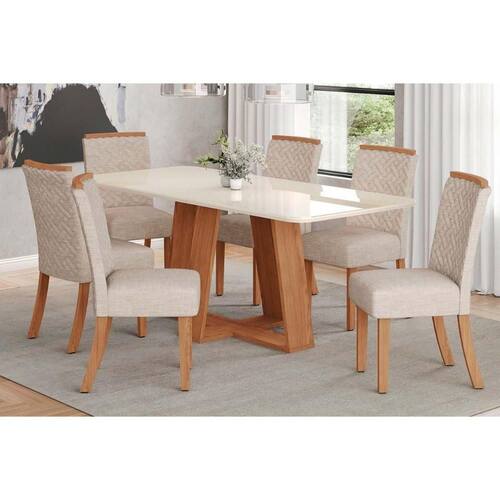 Sala de Jantar Completa Lins c/ Tampo Madeirado c/ Vidro Curvo 200x90cm e 6 Cadeiras Malu Nature/Linho - Henn Abaixo segue os produtos do KIT: Sala de Jantar Completa Lins c/ Tampo Madeirado c/ Vidro Curvo 200x90cm e 6 Cadeiras Malu Nature/Linho - Henn