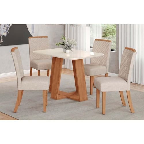 Conjunto: Mesa De Cozinha Lins C/ Tampo Madeirado C/ Vidro Curvo 120x80cm E 4 Cadeiras Malu Nature/linho - Henn