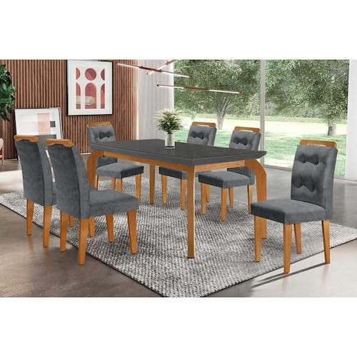 Sala de Jantar Completa Londrina c/ Tampo Madeirado c/ Vidro Canto Curvo 180x90cm e 6 cadeiras Imperatriz Imbuia/Grafite - Suede Grafite - Rufato