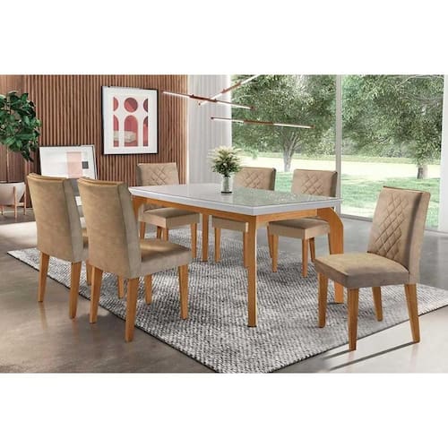 Conjunto: Mesa de Cozinha Londrina c/ Tampo Madeirado c/ Vidro Canto Curvo 180x90cm e 6 cadeiras Jade Imbuia/Off White - Suede Capuccino - Rufato - Blush