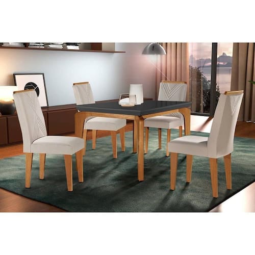 Sala de Jantar Completa Londrina c/ Tampo Madeirado c/ Vidro Canto Reto 120x80cm e 4 cadeiras Amsterdã Imbuia/Grafite - Suede Creme - Rufato