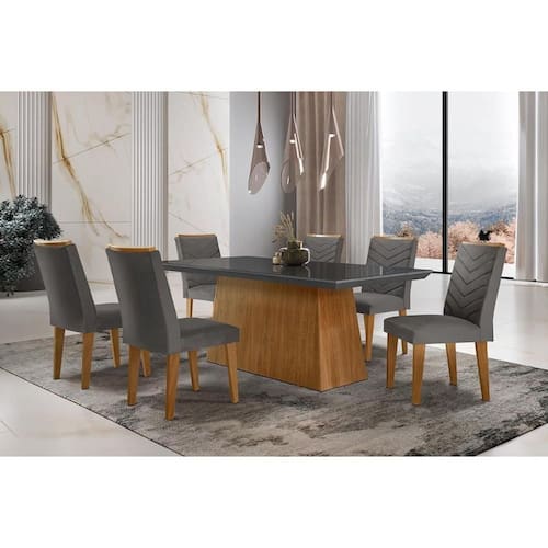 Conjunto: Mesa de Cozinha Luna c/ Tampo de Vidro Canto Curvo 180x90cm e 6 cadeiras Londrina Imbuia/Grafite - Linho Grafite - Rufato - Blush