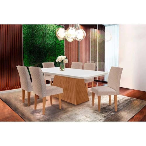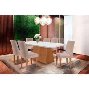 Sala de Jantar Completa Luna Tampo Madeirado Canto Curvo 180x90cm e 6 Cadeiras Grécia Capuccino/Linho Bege Turim - Rufato