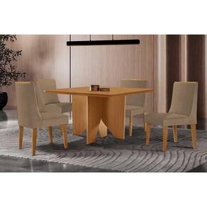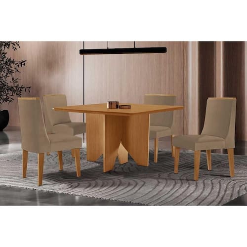 Sala de Jantar Completa Nevada c/ Tampo Madeirado Canto Curvo 90x90cm e 4 Cadeiras Dakota Naturale - Linho Bege - Rufato Abaixo segue os produtos do KIT: Sala de Jantar Completa Nevada c/ Tampo Madeirado Canto Curvo 90x90cm e 4 Cadeiras Dakota Naturale - Linho Bege - Rufato