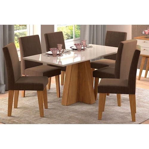Sala de Jantar Completa Patricia c/ Tampo Madeirado c/ Vidro Canto Reto 160x80m e 6 Cadeiras Milena Nature/Suede Joli Chocolate - Cimol Abaixo segue os produtos do KIT: Sala de Jantar Completa Patricia c/ Tampo Madeirado c/ Vidro Canto Reto 160x80m e 6 Cadeiras Milena Nature/Suede Joli Chocolate - Cimol