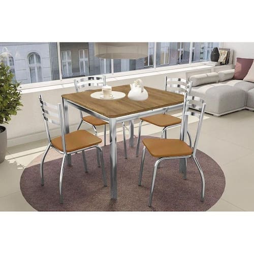 Sala Jantar Mesa Reno c/ Tampo de Madeira 90cm e 4 Cadeiras Portugal Cromada/Capuccino - Kappesberg