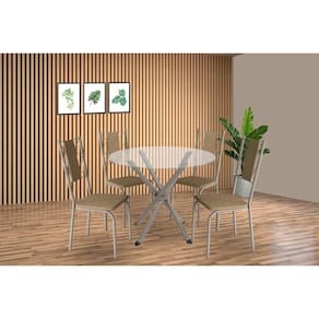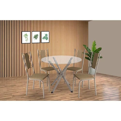Sala de Jantar Completa Volga c/ Tampo de Vidro 95cm e 4 Cadeiras Lisboa Niquel - Courano Capuccino - Kappesberg Abaixo segue os produtos do KIT: Sala de Jantar Completa Volga c/ Tampo de Vidro 95cm e 4 Cadeiras Lisboa Niquel - Courano Capuccino - Kappesberg