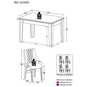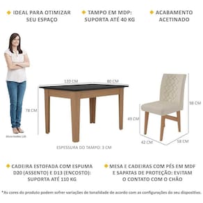 Dimensões do produto montado: Mesa - Altura: 78cm | Largura: 120cm | Profundidade: 80cm Cadeiras - Altura: 98cm | Largura: 42cm | Profundidade: 58cm *Você pode consultar as medidas detalhadas na imagem técnica do produto.