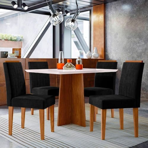 O Conjunto Sala de Jantar Mesa Anitta 1200x800 com 4 Cadeiras Ana Ypê/Off White/Ja03 - New Ceval, conta com a estrutura em Mdf, tampo de MDF 25mm com vidro 3mm, e cadeiras com estrutura em Madeira e com assento e encosto estofados.