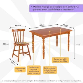Aproveite momentos especiais à mesa com o Conjunto Mesa de Jantar 125cm com 4 Cadeiras Estofadas Multimóveis CR50084. Produzido em madeira maciça de eucalipto com pintura PU, garante durabilidade, resistência e facilidade na limpeza. É composto por 1 mesa e 4 cadeiras no estilo colonial, agregando charme e elegância ao ambiente. O tampo da mesa em MDP suporta até 40kg e as cadeiras suportam até 110kg. As cadeiras contam com estofado de espuma no assento, proporcionando conforto. O modelo na cor Mel possui revestimento do estofado 100% polipropileno, já o modelo Castanho possui revestimento 70% algodão e 30% poliéster.