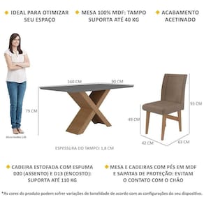 Dimensões do produto montado: Mesa - Altura: 79cm | Largura: 160cm | Profundidade: 90cm Cadeiras - Altura: 93cm | Largura: 42cm | Profundidade: 63cm *Você pode consultar as medidas detalhadas na imagem técnica do produto.