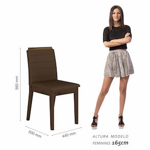 Detalhes Técnicos das Cadeiras - Assento e Encosto Tapeçados, Estofados e Fixos - Cadeira suporta até 90kg - Facilidade Montagem: Média - Tonalidade Cadeira: Imbuia/Suede Marrom - Assento: D16 - Encosto: D14 - Pintura UV Texturizada - Material Estrutura: MDF 18mm e 25mm - Medida de cada Cadeira: A:95cm | L:44cm | P:50cm