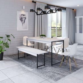 Possui Rodízio: Não Altura do Conjunto: 74 cm Ambiente: null Ambiente Principal: Sala de Jantar Cor: Branco Chess Informação Complementar: 1x Conjunto de 4 Cadeiras Pp Base Madeira Eames Dsw-m BrancoLargura: 46Altura: 82Peso: 3,4Profundidade: 52Necessita Montagem: Sim1x Conjunto Mesa de Jantar com 1 Banco Estilo Industrial Active Branco ChessNecessita Montagem: Sim Suporta Até (kg): 110 Tamanho: